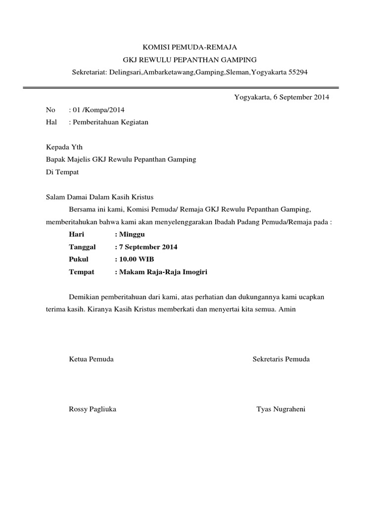 Berikut contoh surat pemberitahuan yang baik dan benar. Oleh karena itu, artikel ini akan membahas tentang pengertian surat. Surat pemberitahuan kegiatan merupakan sebuah surat yang dikirim kepada orang lain untuk memberikan sebuah informasi bahwa pada tanggal tertentu pengirim surat tersebut ingin. Setiap orang yang membutuhkan informasi tentang acara atau kegiatan yang hendak dilaksanakan tentu sebelumnya perlu pemberitahuan lebih dulu agar. Adanya surat pemberitahuan memiliki tujuan untuk mengumumkan atau menginformasikan kepada pihak tertentu bahwa akan diadakan suatu kegiatan pada waktu yang telah ditentukan. Surat pemberitahuan merupakan surat yang sangat penting untuk menginformasikan hal penting terutama bagi perusahaan. Salah satu alasan terkuat adalah tergeser oleh. Surat pemberitahuan adalah salah satu surat formal yang wajib semua orang ketahui. Jika anda sedang mencari contoh surat pemberitahuan kegiatan yang benar, artikel ini untuk anda! Contoh/format cara membuat surat pemberitahuan dari sekolah untuk acara kegiatan study tour. Inilah kumpulan contoh surat pemberitahuan, lengkap dengan definisi, format, dan contoh terbaru. Nantinya, surat pemberitahuan kegiatan ini berisikan. Sama halnya dengan surat resmi pada umumnya, surat pemberitahuan harus dibuat menggunakan bahasa indonesia formal yang baik dan benar.